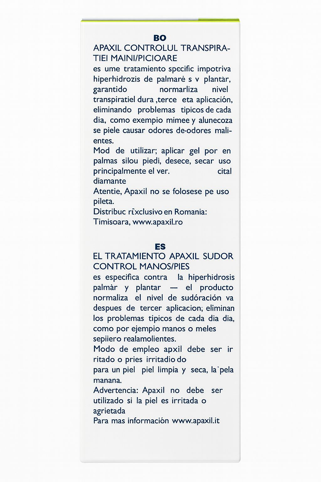 Apaxil Tratament Transpiratie maini/picioare este bazat pe acelasi principiu ca si tratamentul pentru transpiratie axilara, reduce în maniera eficienta neplacutul efect de “ amprenta “ si senzatia de umed datorita sistemului tampon ce “blocheaza“ glandele sudoripare. Este un tratament specific împotriva hiperhidrozei palmare si plantare, forma sa specifica combate rapid neplacutul efect “amprenta“, generat de o transpiratie excesiva si de cauza problemelor zilnice (de exemplu o mâna umeda si alunecoasa sau picioare cu miros dezagreabil si persistent). Acest produs este un tratament cu effect indelungat (minim 4 saptamani intre aplicari) si se recomanda utilizarea sa doar seara. Formula sa originala bazata pe clorura de aluminiu si compozitie de gel, asigura rapid uscarea lasand o senzatie placuta de improspatare fara parfumare.